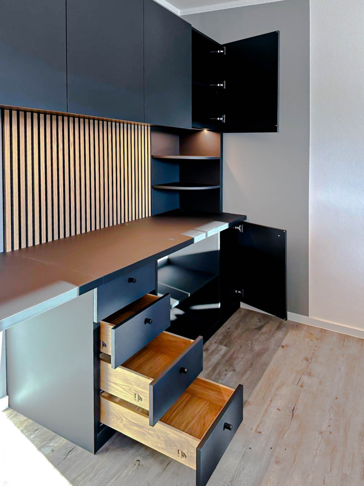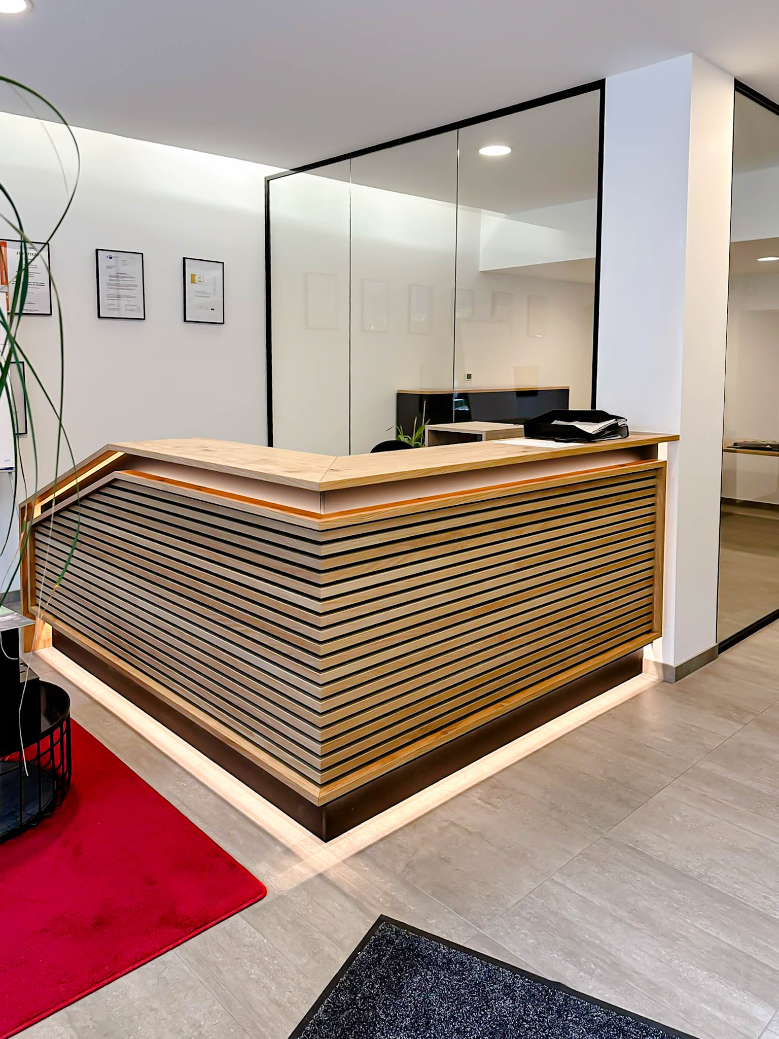 Die Theke im Eingangsbereich wurde aus hochwertigem Echtholzfurnier gefertigt, kombiniert mit matten Akzentflächen und einer indirekten Beleuchtung, die den Raum einladend wirken lässt. Ergänzend entstanden individuelle Schreibtische mit ergonomisch geformten Platten sowie passgenaue Stauraumschränke und eine Holzlamellenwand, die Struktur und Wärme ins Gesamtbild bringt.