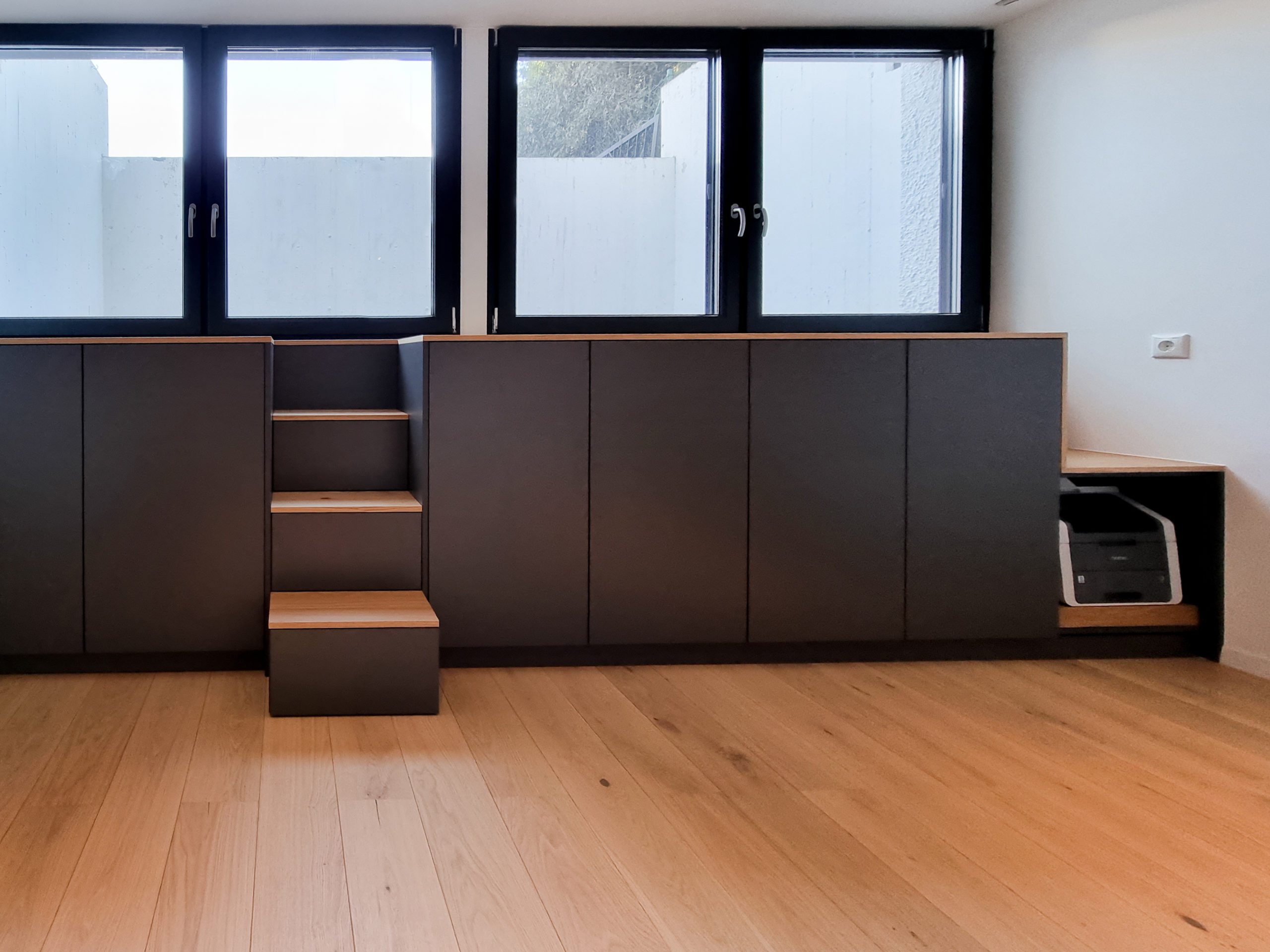 Für diesen modernen Unternehmensstandort haben wir den kompletten Empfangsbereich sowie maßgefertigte Arbeits- und Stauraumlösungen realisiert – exakt abgestimmt auf Raum, Nutzung und Markenauftritt.