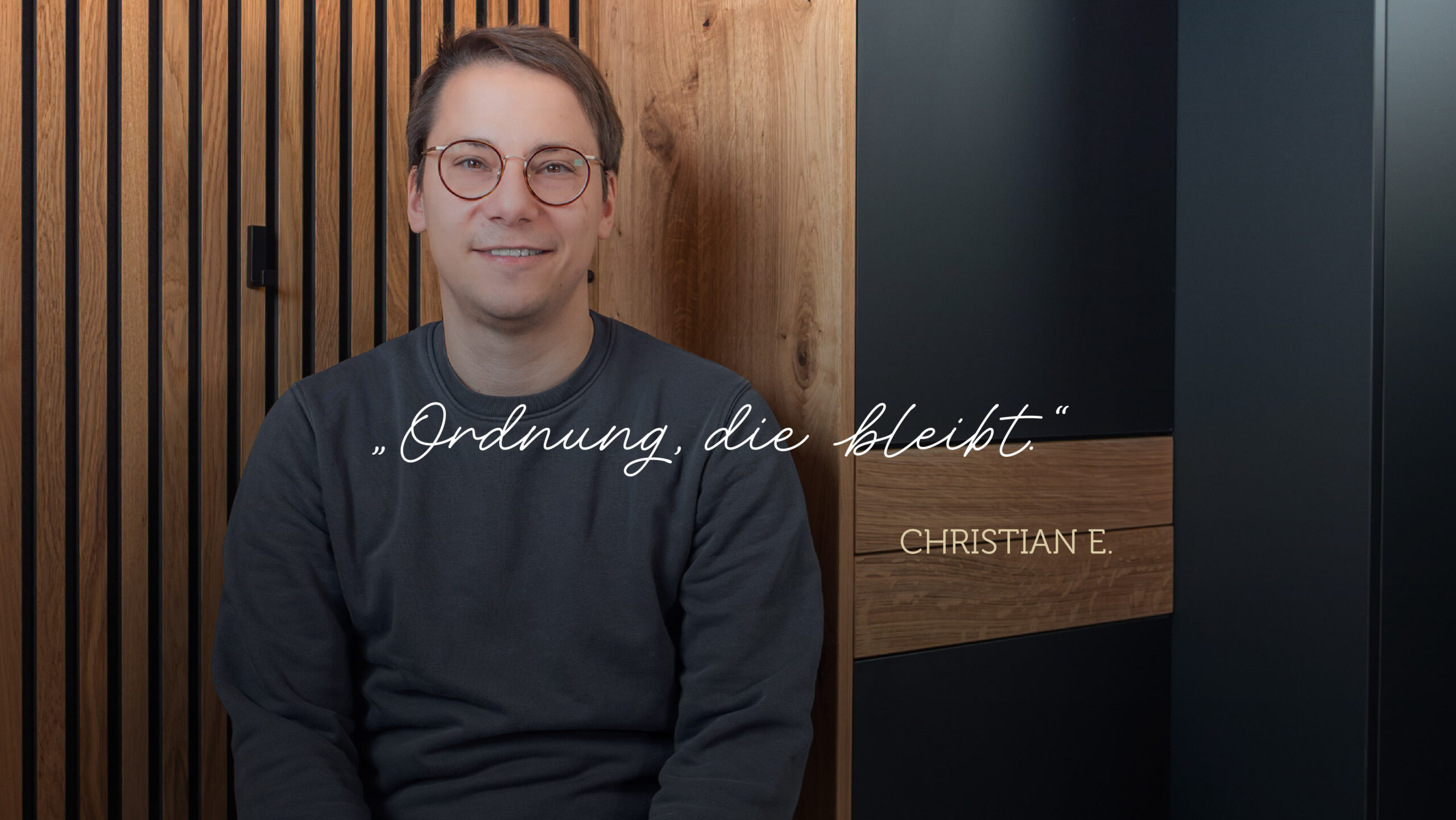 Christian E. bekam eine Garderobe mit schwarzmatten Holzfronten, integrierter Sitzfläche und Paneelen mit Aufhängungen – eine durchdachte Lösung, die endlich Ordnung in seinen Flur bringt.