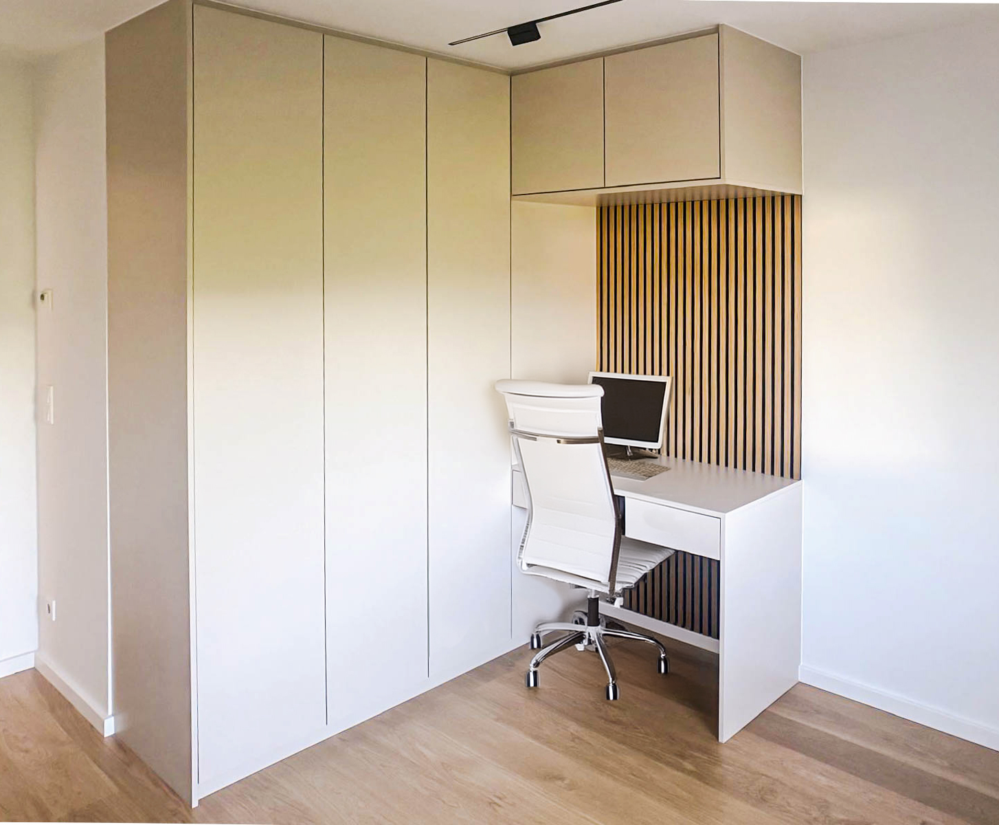 Büro in weiß mit Holzpaneelen und kleiner Sitzgelegenheit