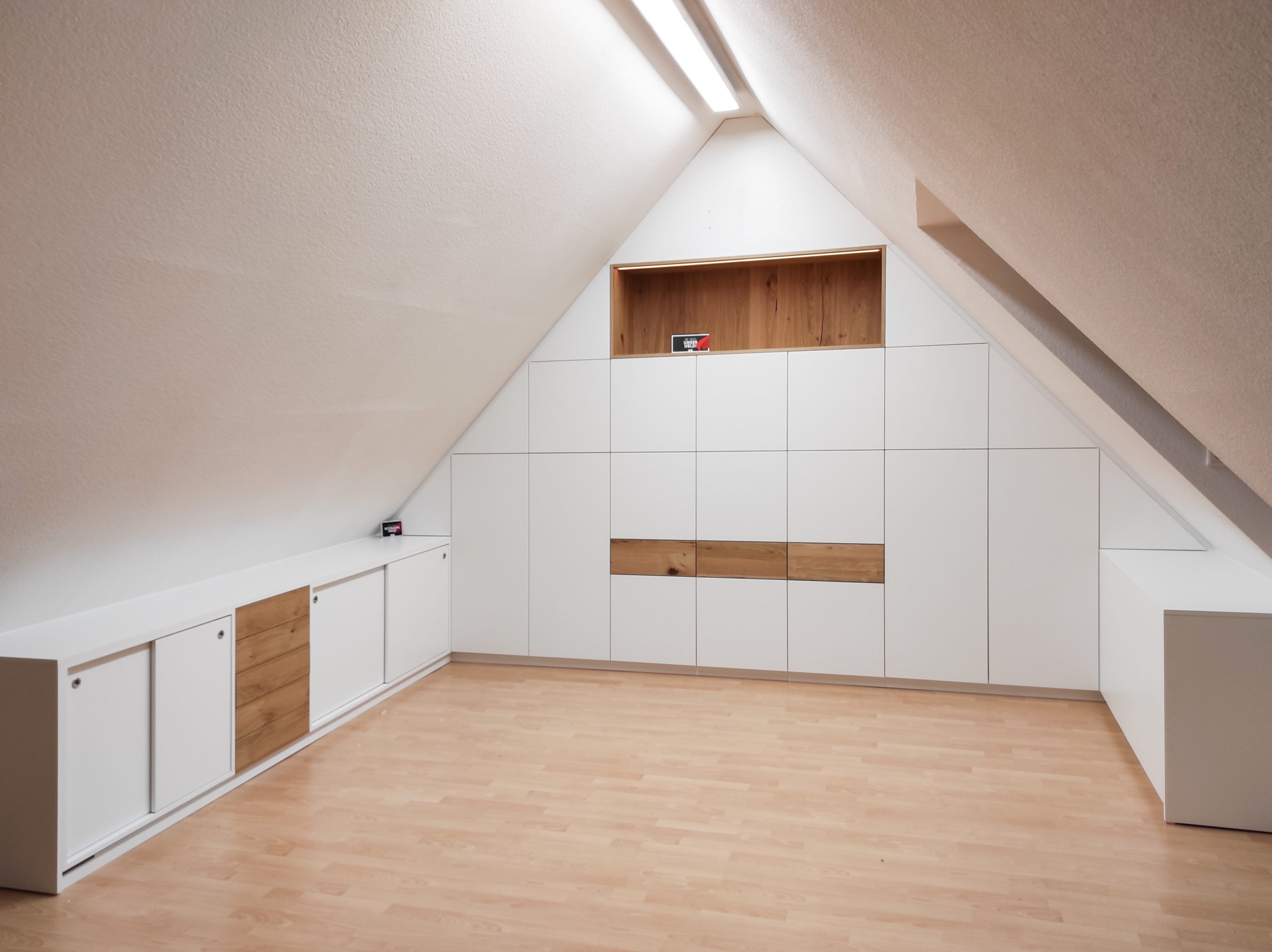 Archivschränke von der Stange funktionieren in Standardsituationen – aber was, wenn Dein Raum eine Dachschräge hat? Oder Du eine Kombination aus offenen Regalen und geschlossenen Archivtüren möchtest?