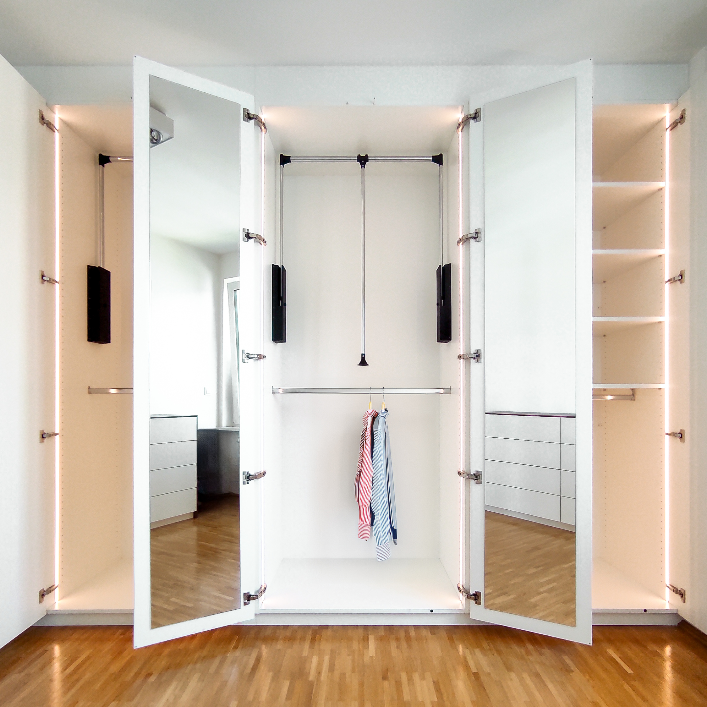 Der klassische Einsatzbereich für Kleiderlifte sind Kleiderschränke, insbesondere solche mit hoher Bauweise. Hier hilft der Lift, den oberen Stauraum effektiv zu nutzen.