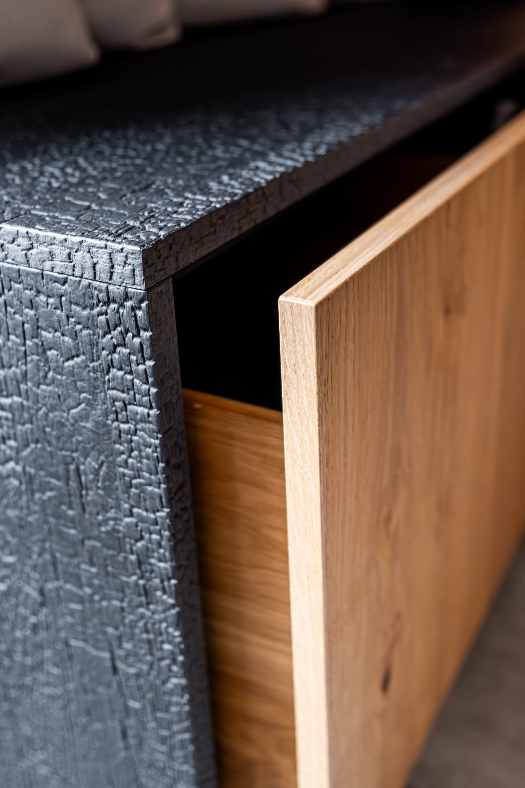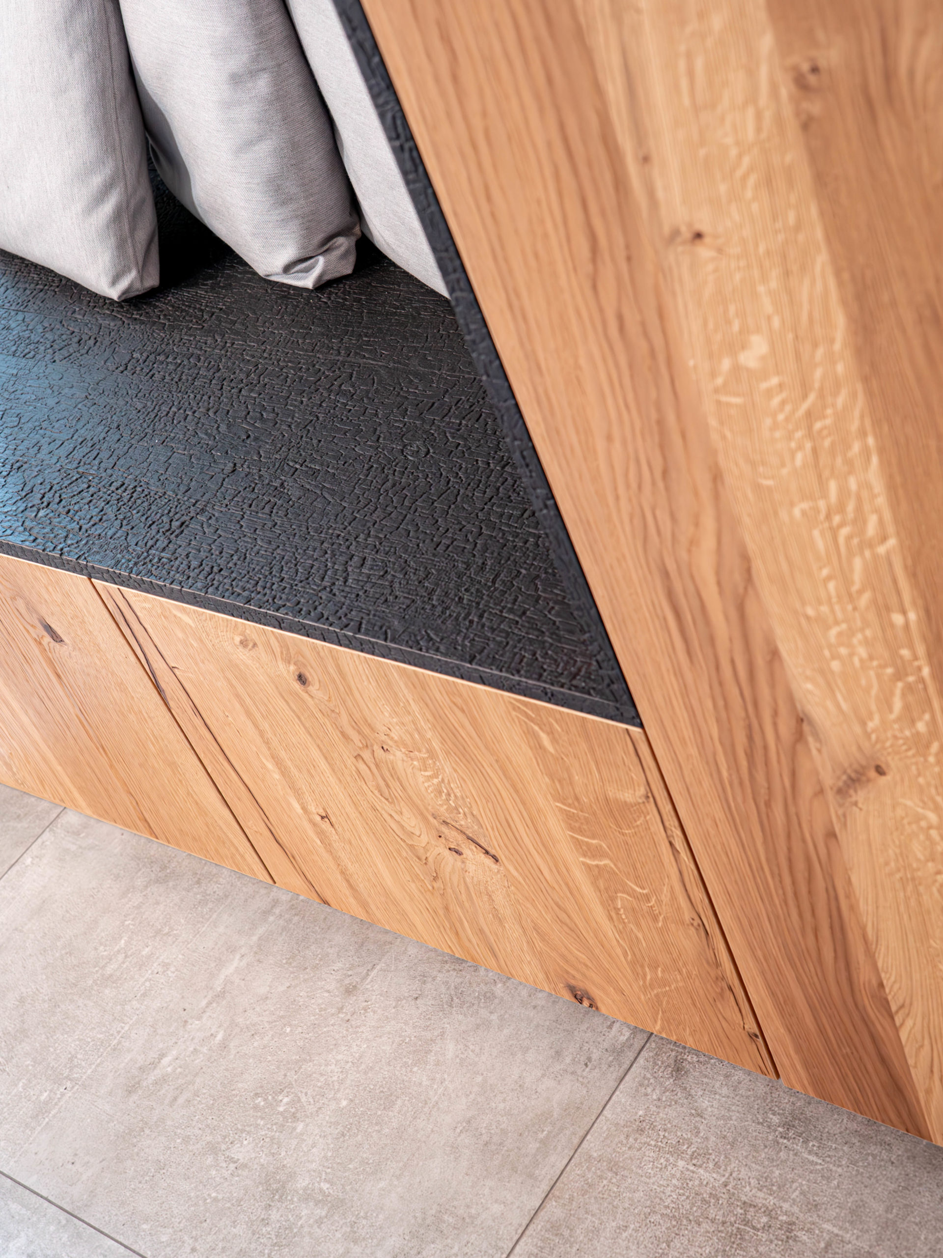 Der Schrank wurde passgenau in die Nische geplant – mit bewusst gesetzten Akzenten: Die schwarze, strukturierte Oberfläche in der Sitznische setzt einen kraftvollen Kontrast zur natürlichen Eiche.