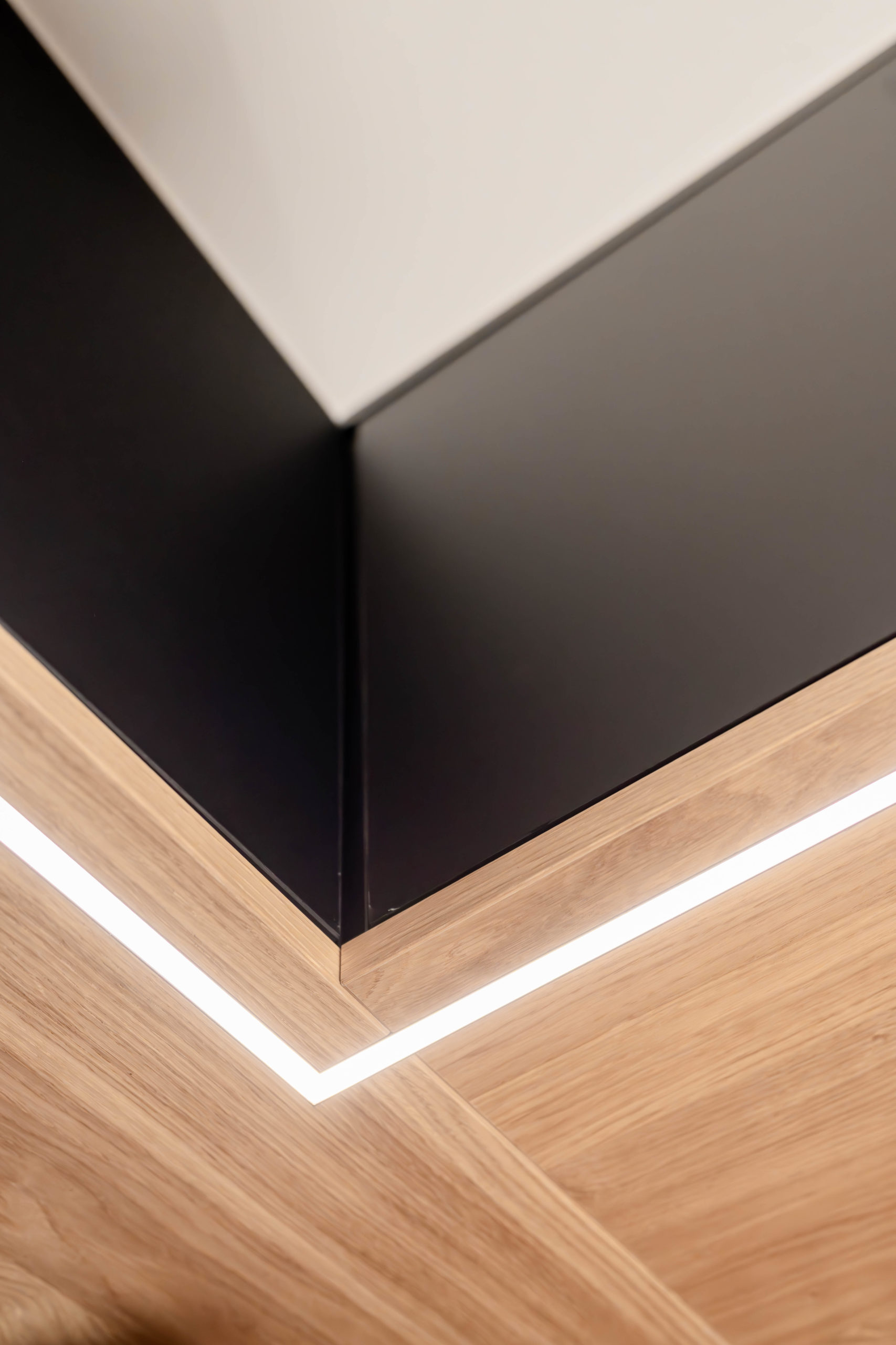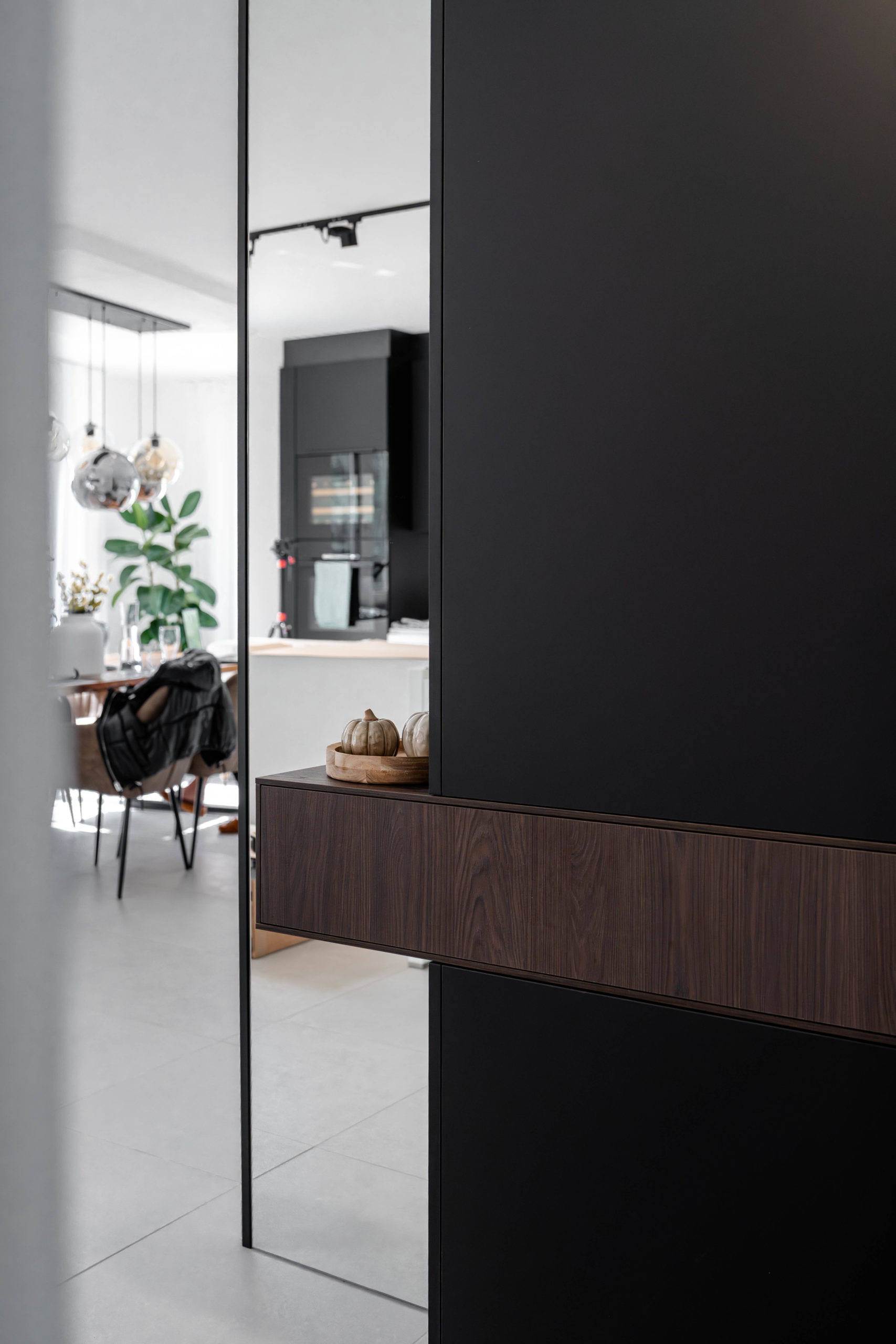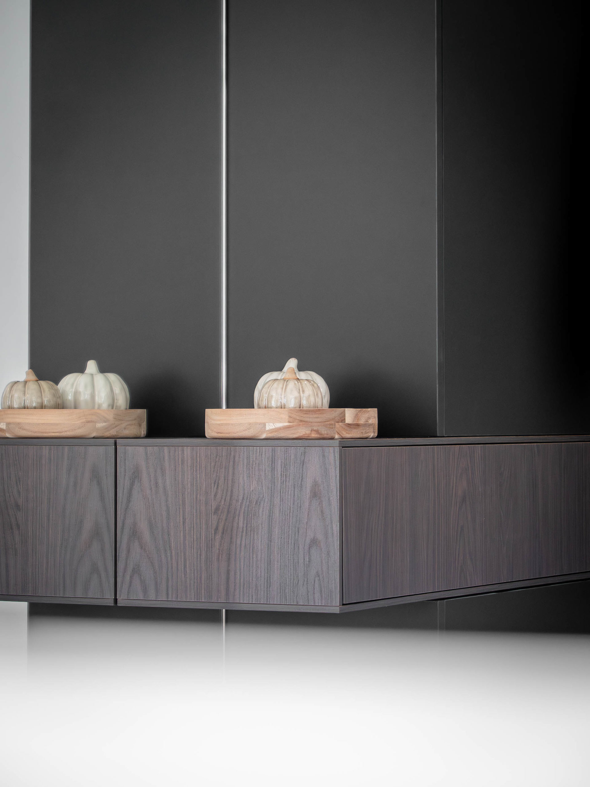 Mit millimetergenauer Planung und hochwertigem Materialmix aus dunklem Mattlack, warmem Holz und indirektem Licht wurde eine Lösung geschaffen, die nicht nur Stauraum bietet – sondern echtes Interior-Statement ist.