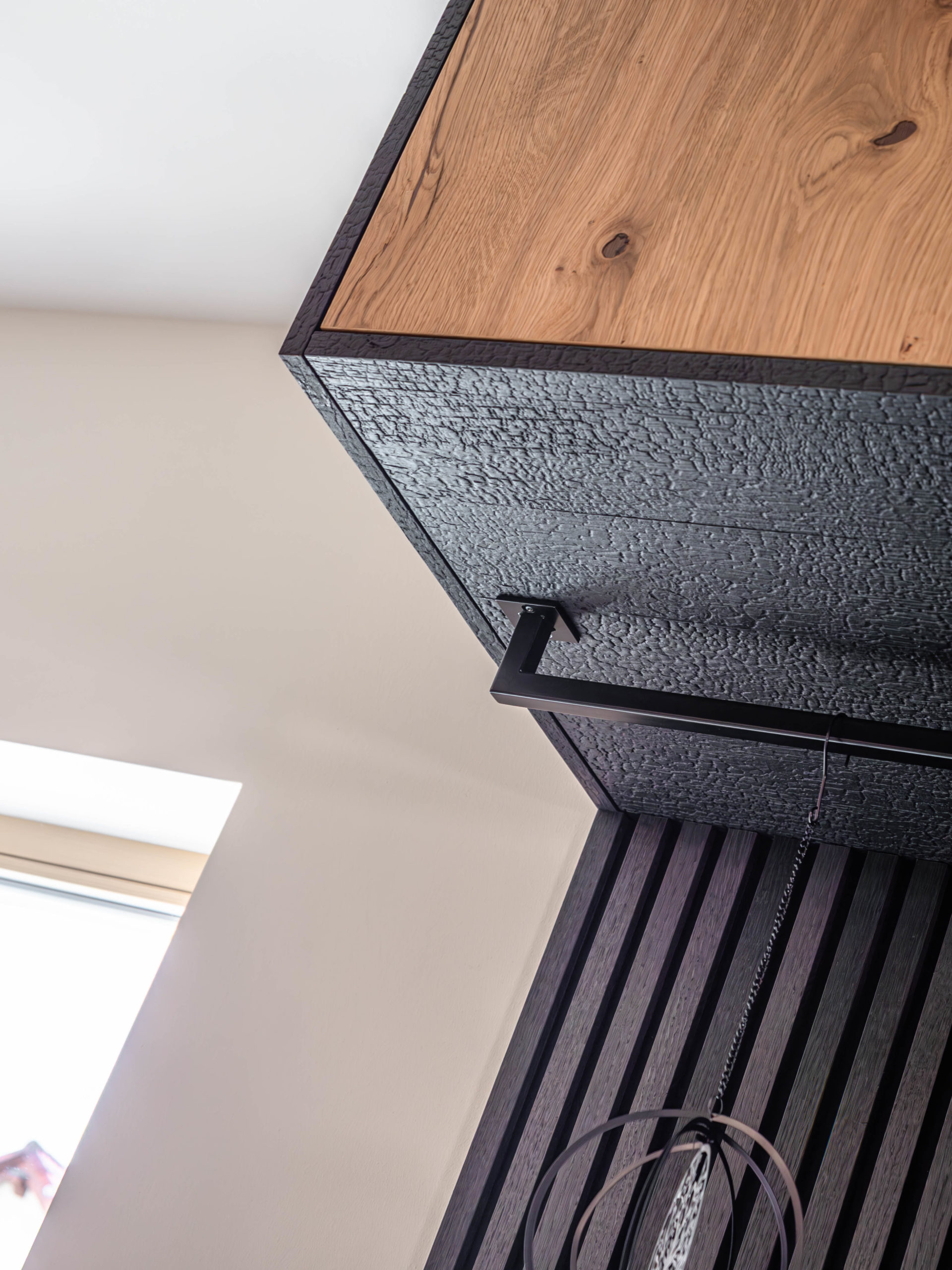 Diese maßgefertigte Garderobe ist mehr als nur Stauraum: Sie verbindet klare Linien mit wohnlicher Wärme – und schafft gleichzeitig Struktur und Atmosphäre im Eingangsbereich. Die Kombination aus gebürstetem Schwarz, markanter Holzmaserung und clever integrierten Funktionen verleiht dem Schrank eine einzigartige Präsenz, ohne sich in den Vordergrund zu drängen.