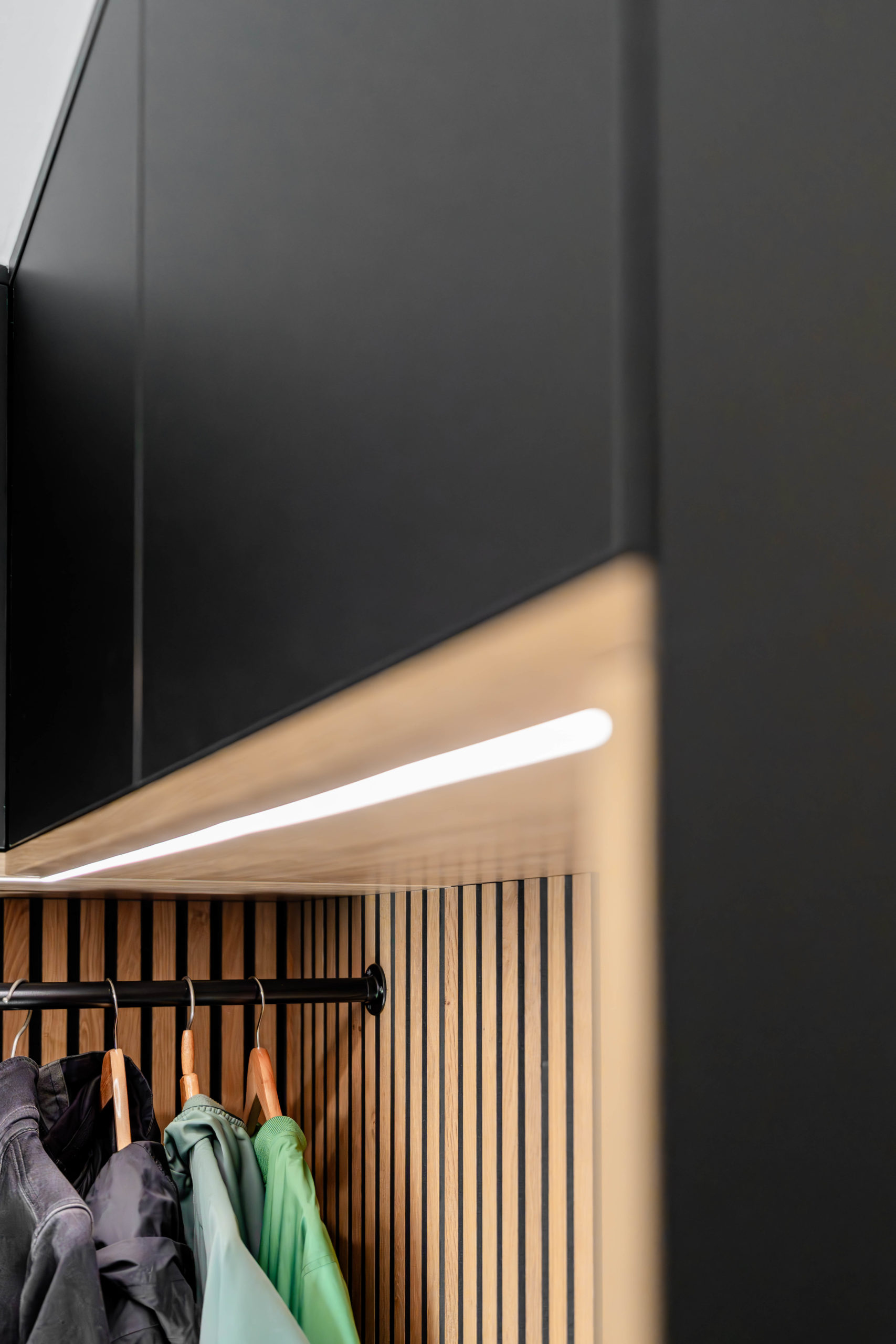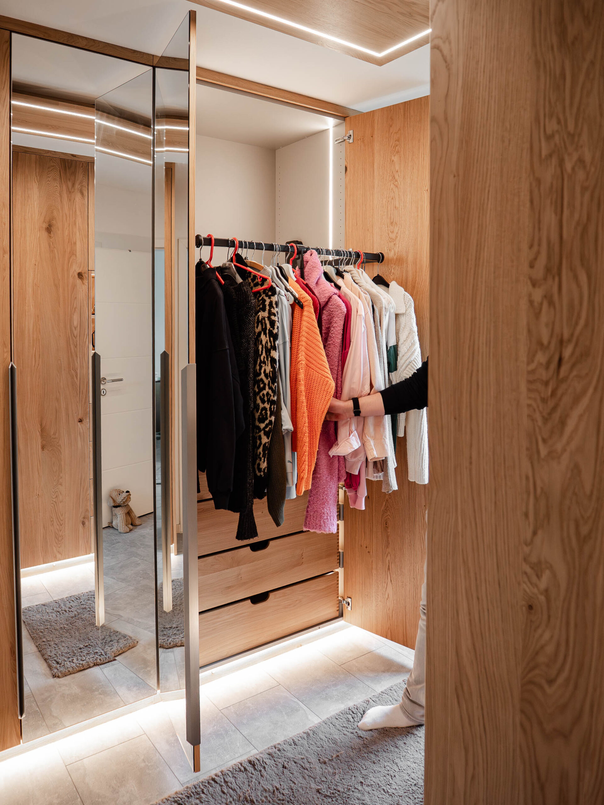 Die indirekte LED-Beleuchtung setzt nicht nur Akzente, sondern verleiht der Garderobe Leichtigkeit und Tiefe.