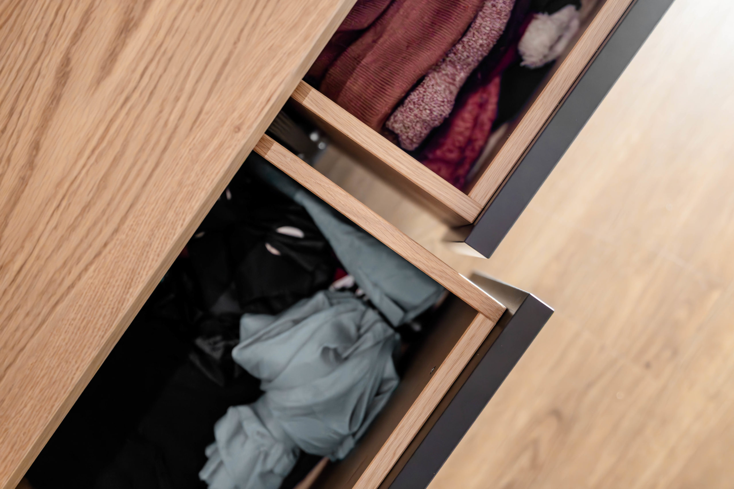 Besonders wichtig war eine unauffällige Schublade für Kleinigkeiten des Alltags sowie eine ausziehbare Kleiderstange, die bei Bedarf genutzt und anschließend wieder platzsparend verstaut werden kann.