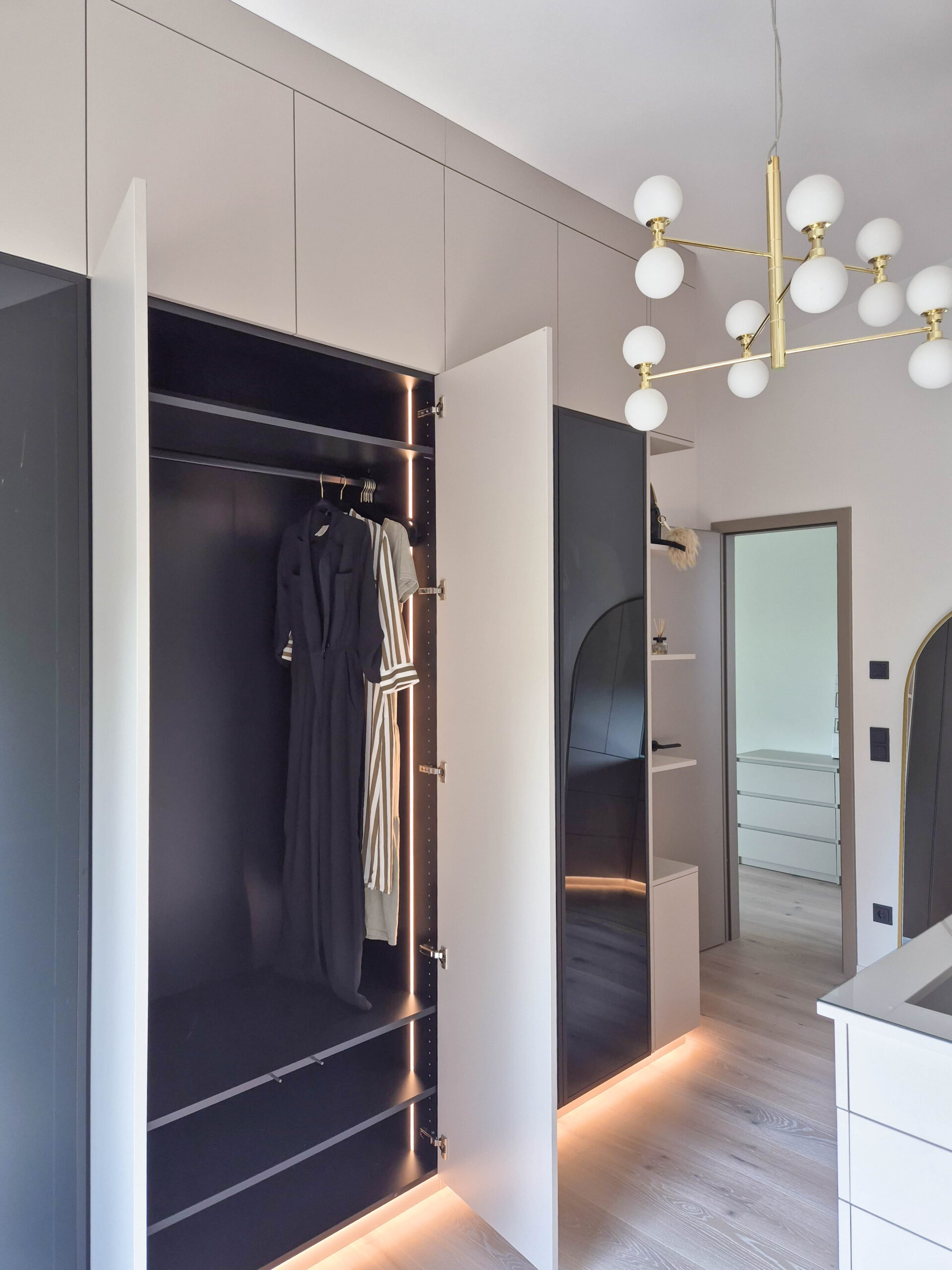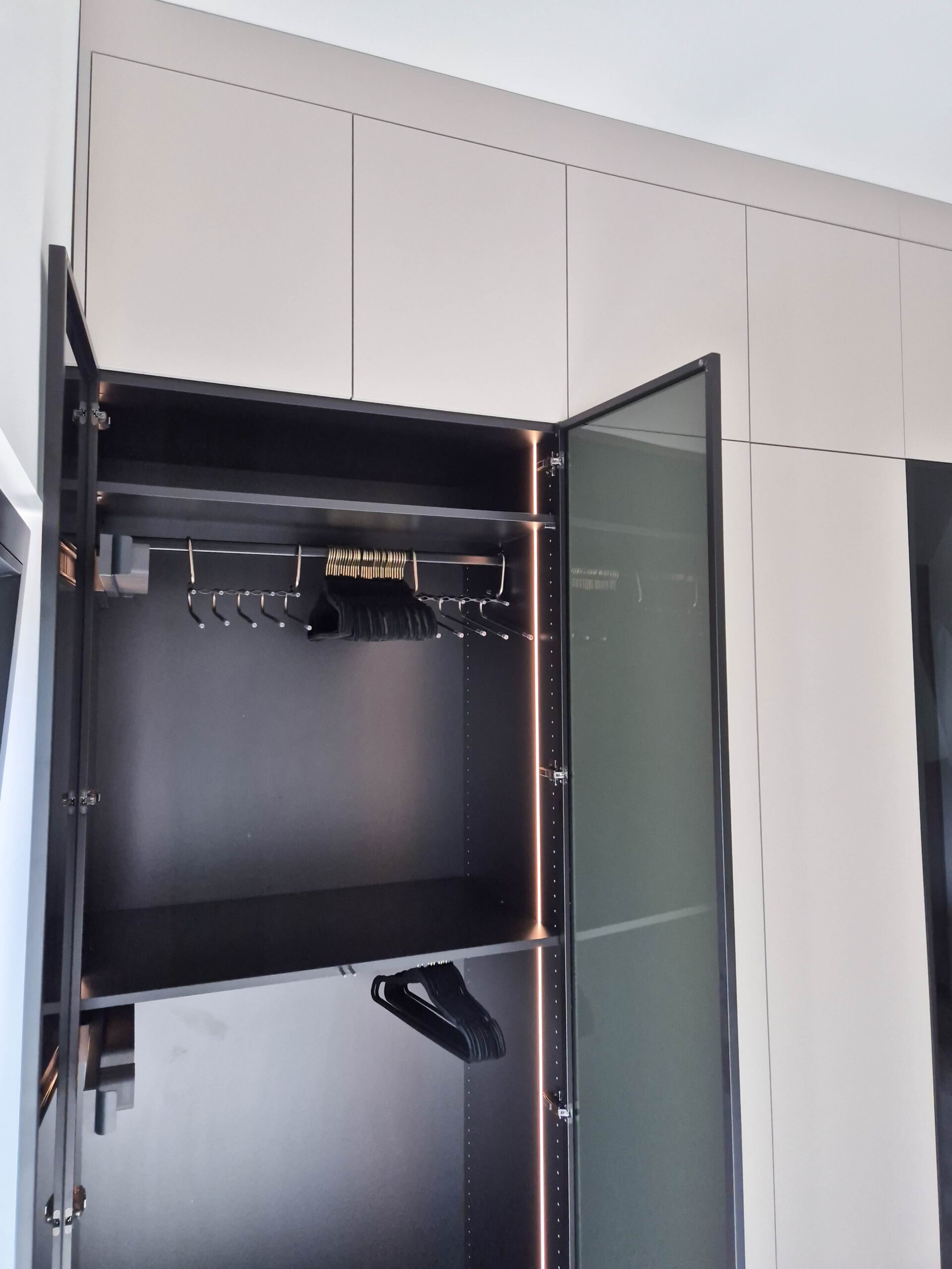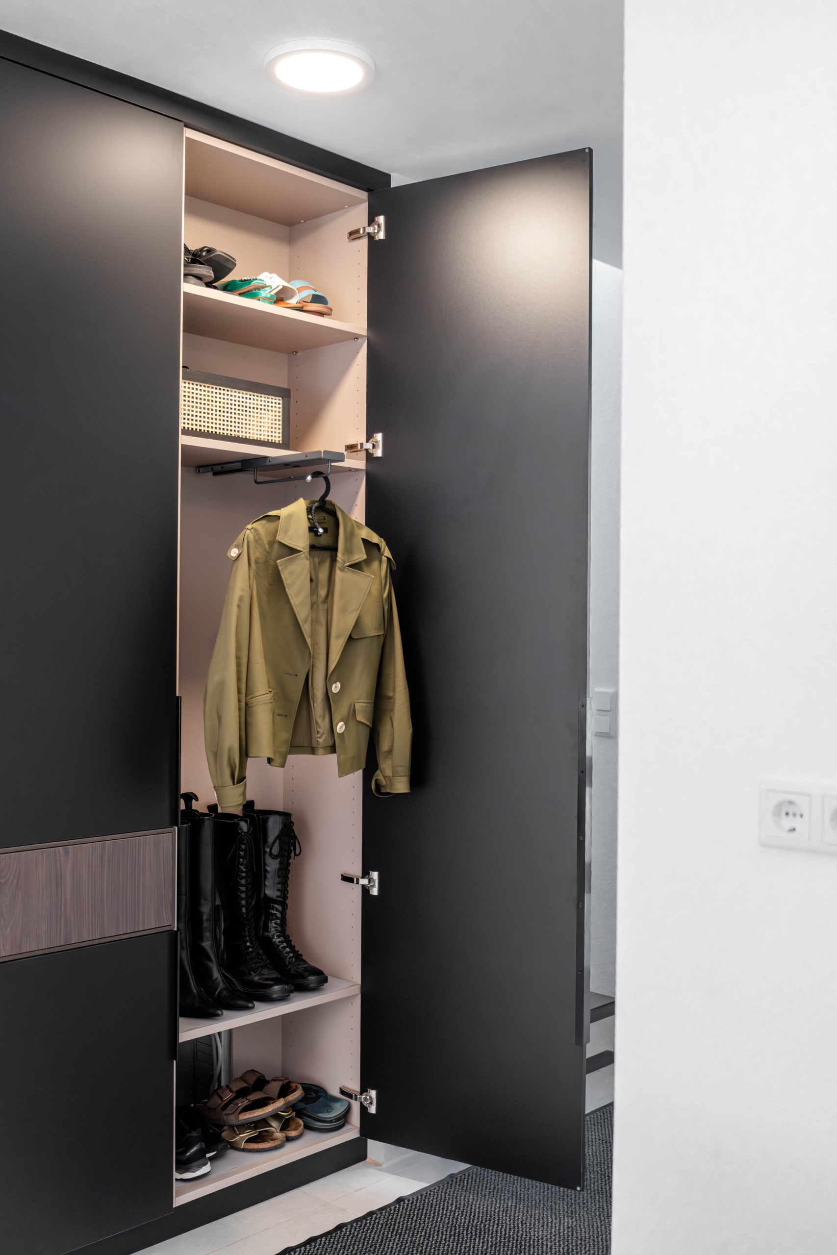 Innen sorgen durchdachte Fächer, Kleiderstangen und Stauraumlösungen für Ordnung, während die Fronten bewusst grifflos und ruhig gehalten wurden.