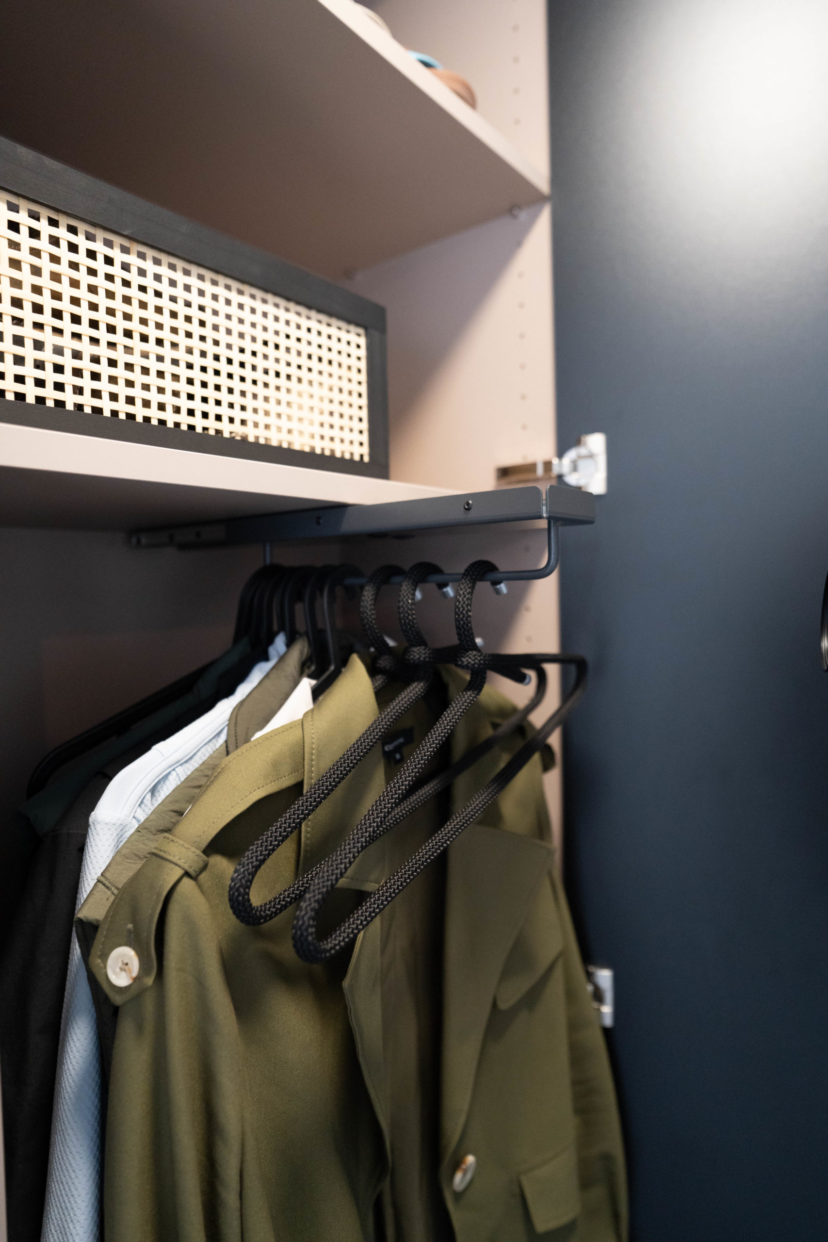 Im Inneren verbirgt sich eine ausziehbare Kleiderstange, die bei Bedarf zum Einsatz kommt – und danach wieder verschwindet.