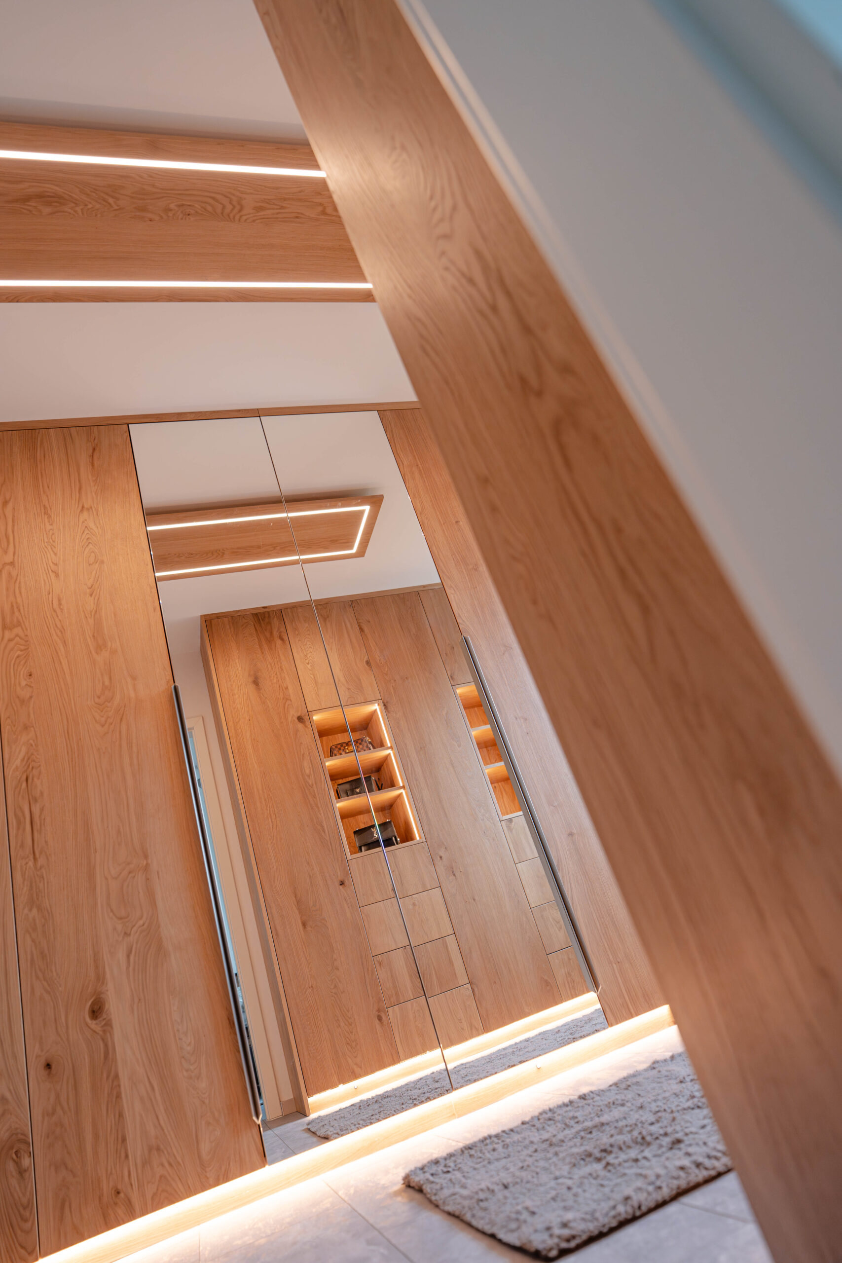 Wildeiche, sanft integrierte LED-Beleuchtung und präzise gesetzte Details wie Kleiderlifte und offen gestaltete Regalfächer machen aus diesem Projekt eine durchdachte Kombination aus Ordnung, Ästhetik und Wohlfühlatmosphäre.