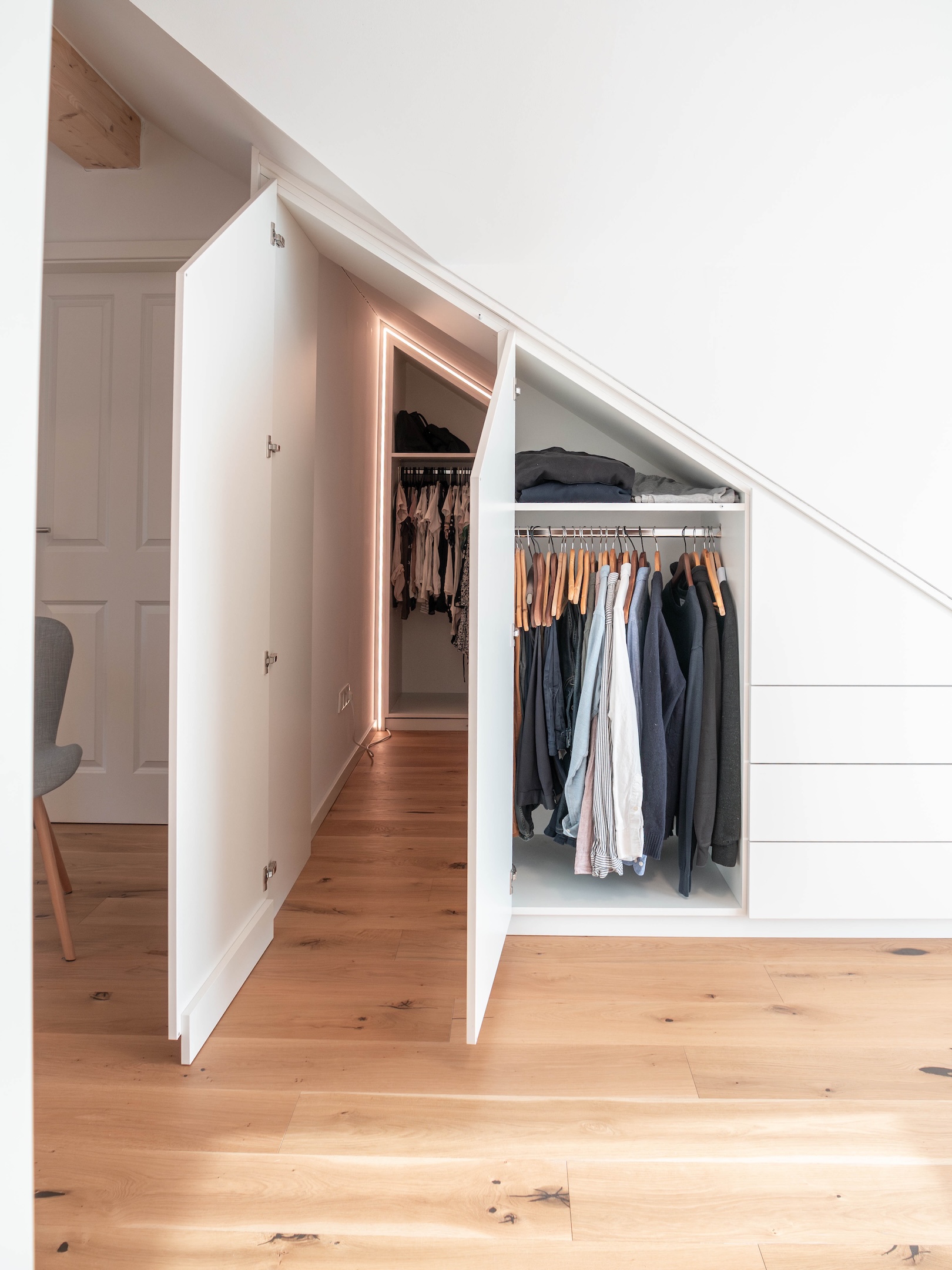 Wir bieten eine Vielzahl von maßgefertigten Schranklösungen an, darunter Einbauschränke, Garderobenschränke nach Maß, Ankleiden nach Maß, Dachschrägenschränke und Treppenunterschränke. Gemeinsam finden wir die perfekte Lösung für Deine Bedürfnisse und Deinen Raum.