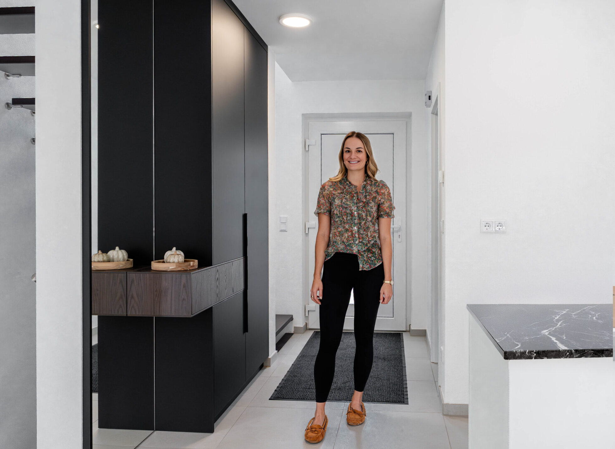 Maßgefertigte Garderobe nach Maß mit Sitznische, Stauraum und markantem Materialmix aus Holz und Schwarz. Eine Lösung, die Funktion und ersten Eindruck im Eingangsbereich perfekt verbindet.