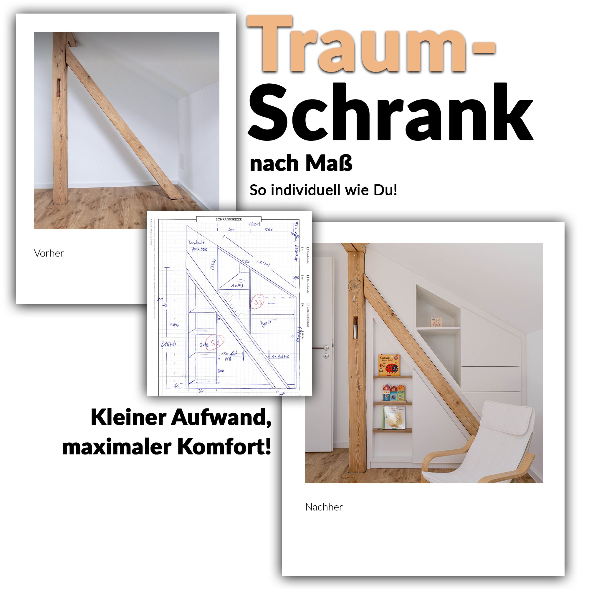 Keine Sorge – genau das schließen wir durch unsere sorgfältige Planung aus. Einer unserer Schrankhelden nimmt vor Ort millimetergenau Maß und berät Dich so umfassend, dass beim späteren Aufbau alles passt.