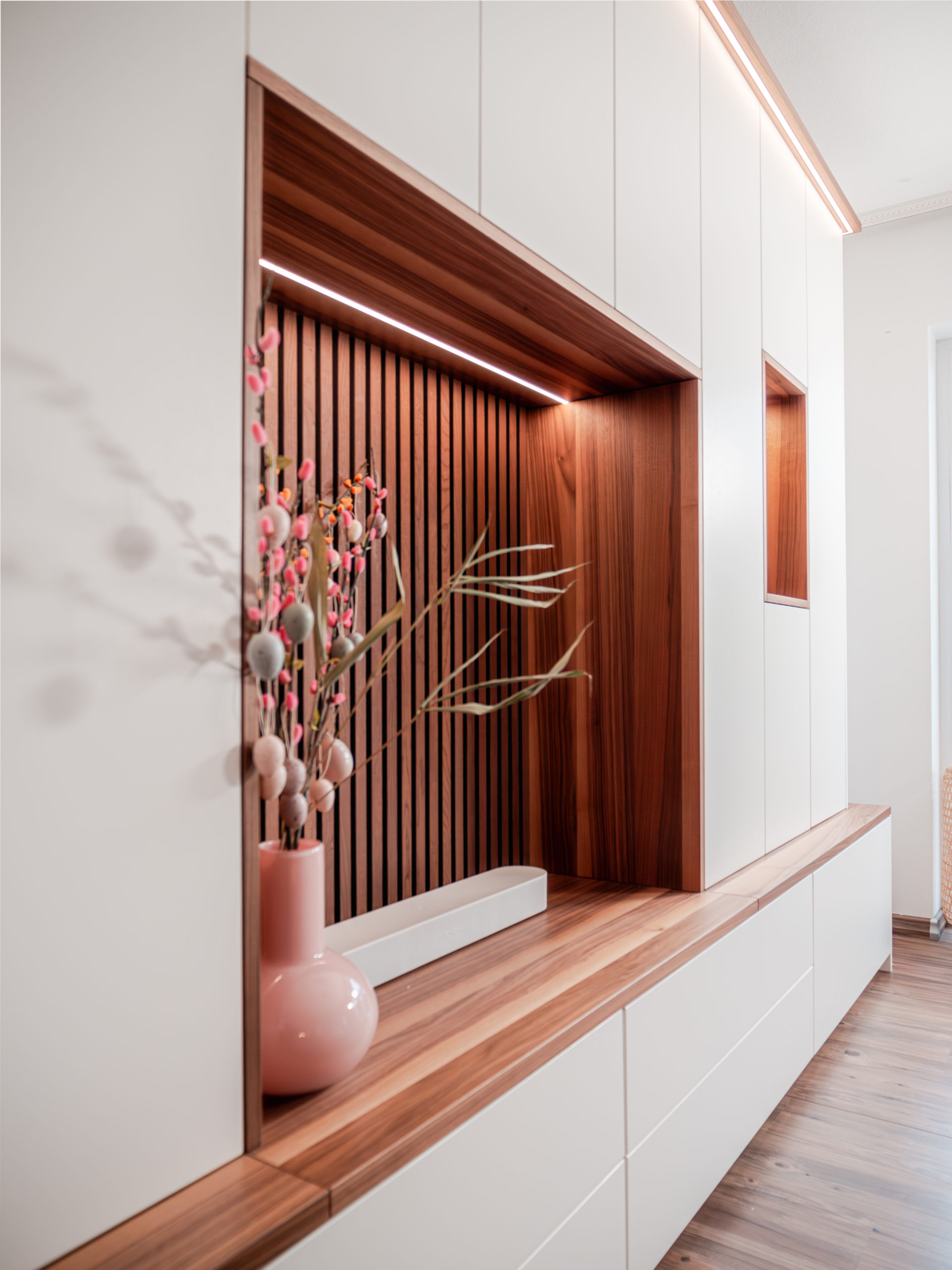 Du wählst Farben, Materialien, Aufteilung – wir übernehmen die Planung, Fertigung und Montage. Auch Sonderwünsche wie integrierte LED-Beleuchtung, unsichtbare Kabelführung oder durchdachte Stauraumlösungen sind für uns Standard.
