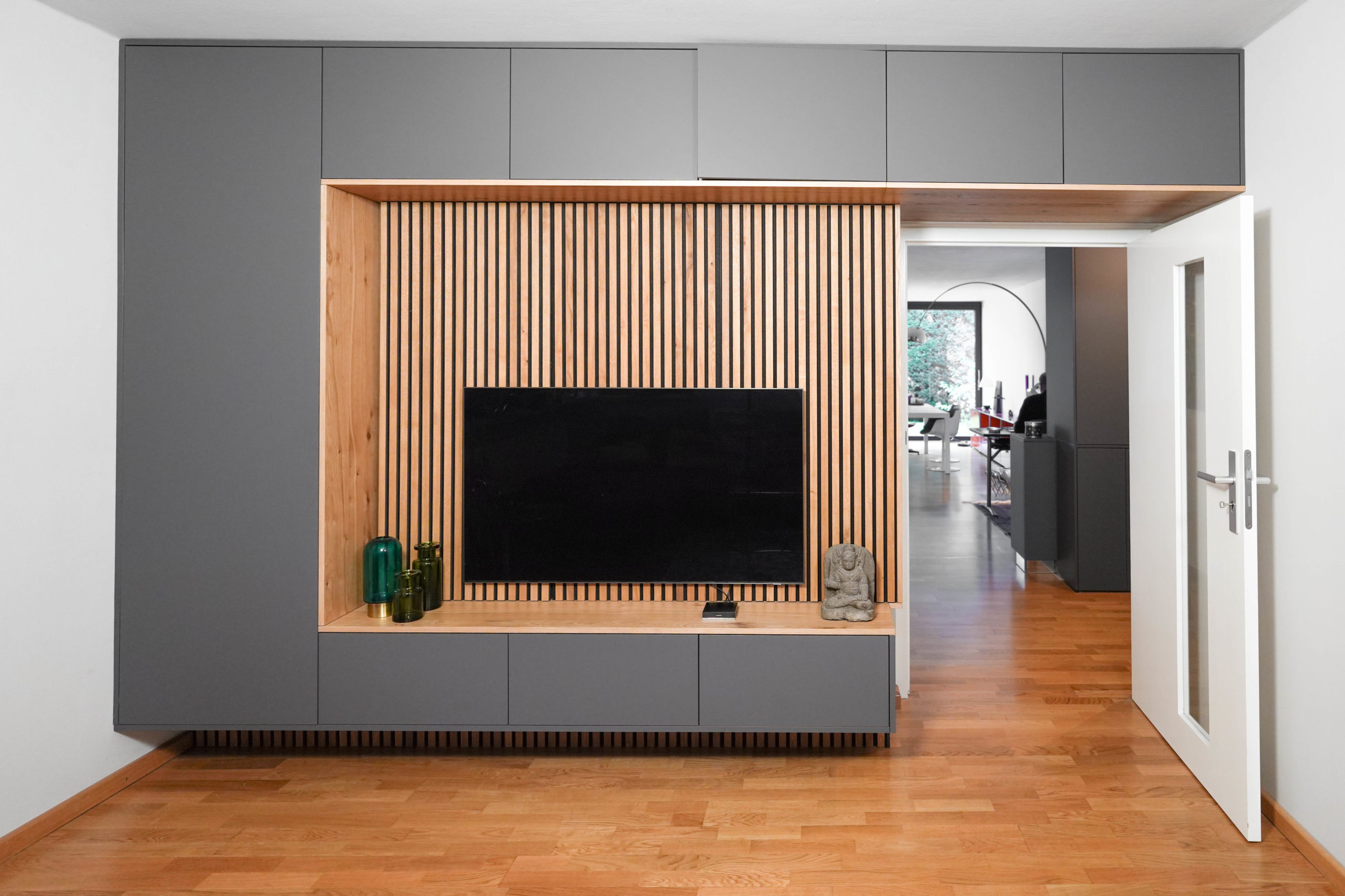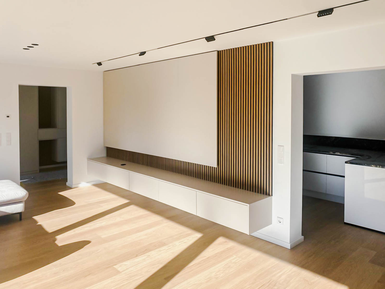 Eine maßgefertigte Wohnwand verbindet Design und Funktion perfekt miteinander. Sie nutzt den vorhandenen Raum optimal aus und bietet Stauraum genau dort, wo Du ihn brauchst – stilvoll, individuell geplant und bis ins Detail durchdacht. Kein Möbel von der Stange, sondern ein echtes Statement für Dein Zuhause.
