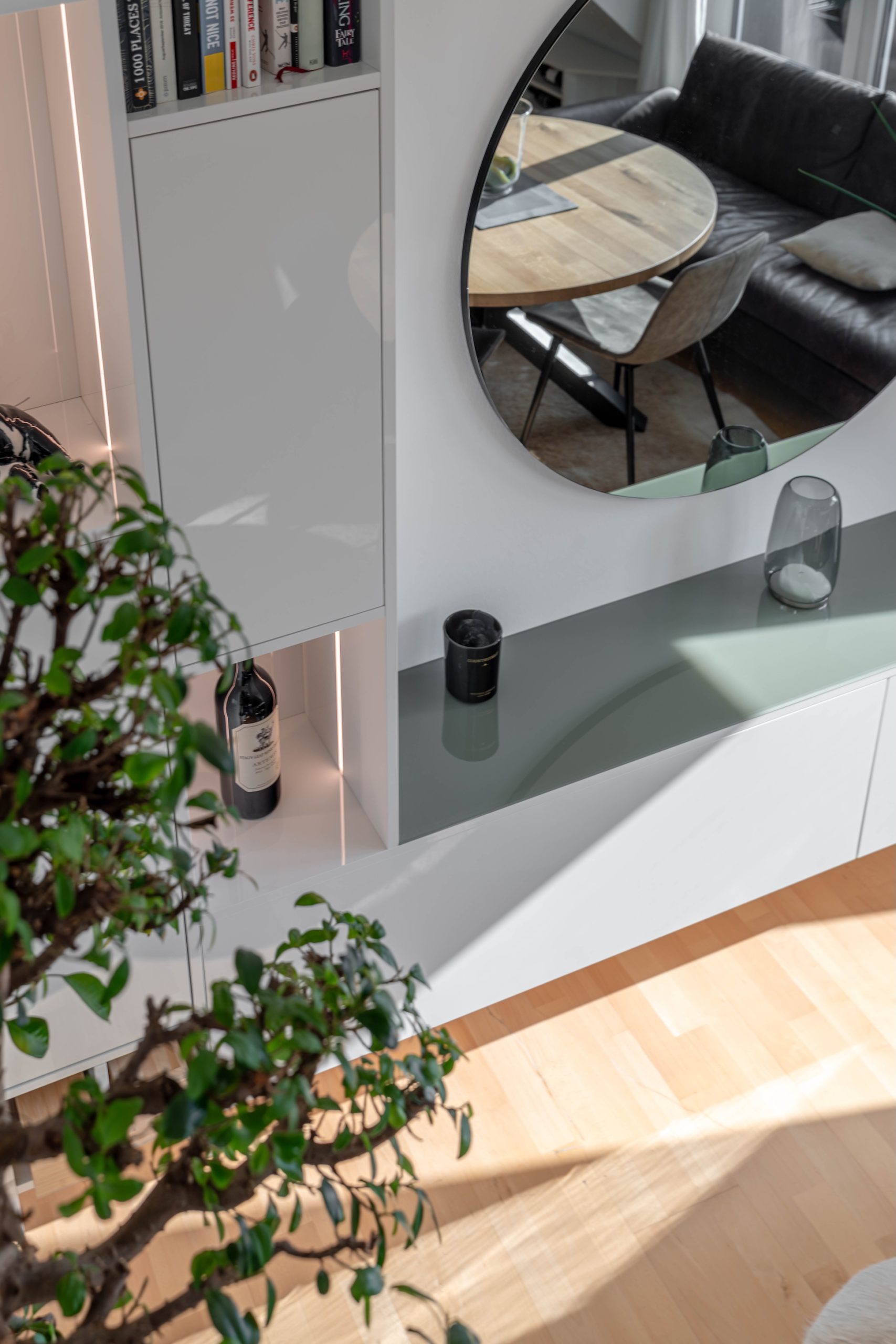 Mit einer großen Auswahl an edlen Oberflächen, Farben, Griffen und Materialien wird Deine Wohnwand zum Herzstück Deines Wohnzimmers. Von clean und grifflos bis hin zu warmen Holzdetails oder offenen Regalelementen – alles ist möglich. Maßgefertigt heißt bei uns: Du entscheidest über jedes Detail.